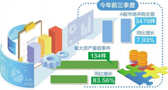 今年以来,A股并购重组市场活跃。万得资讯(Wind)数据显示,今年前三季度A股市场并购交易3470件,同比增长7.93%;重大资产重组事件134件,同比增长83.56%。其中,多家上市公司以彻底转型为核心目标,或通过并购来寻找新增长点。特别是沪市,“并购六条”实施以来新增的重大并购方案中,有近三成是转型升级案例。