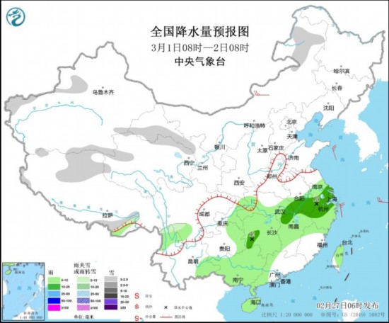 3月1日08时至2日08时,内蒙古东北部、新疆西部山区、西藏北部、青海北部、甘肃中西部等地部分地区有小雪。苏皖南部、浙江、湖北南部、重庆东部、贵州东部、湖南、江西、广西、海南岛、台湾岛等地部分地区有小到中雨(10~15毫米)。内蒙古中部部分地区有4~6级风(见图3)。