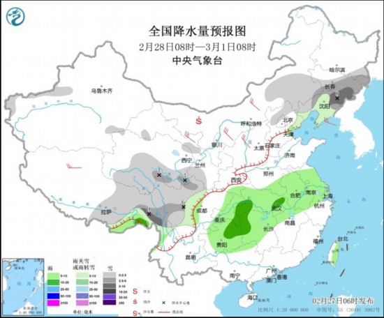 2月27日08时至28日08时,西藏大部、青海大部、甘肃中南部、陕西北部、山西中北部、河北北部等地部分地区有小到中雪或雨夹雪,其中,西藏东南部局地有大雪。重庆、江苏南部、陕西中部、山西南部、河北西南部、台湾岛大部等地有小雨。新疆东部、内蒙古中西部、吉林等地部分地区有4~6级风。新疆南疆盆地、内蒙古西部、甘肃西部等地的部分地区有扬沙或浮尘天气。