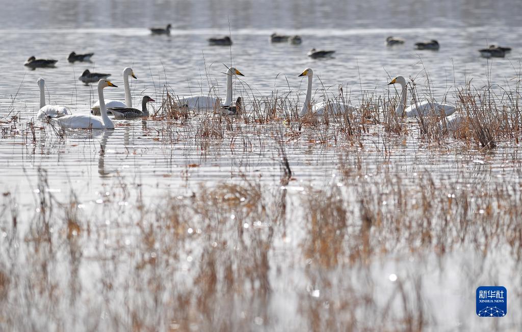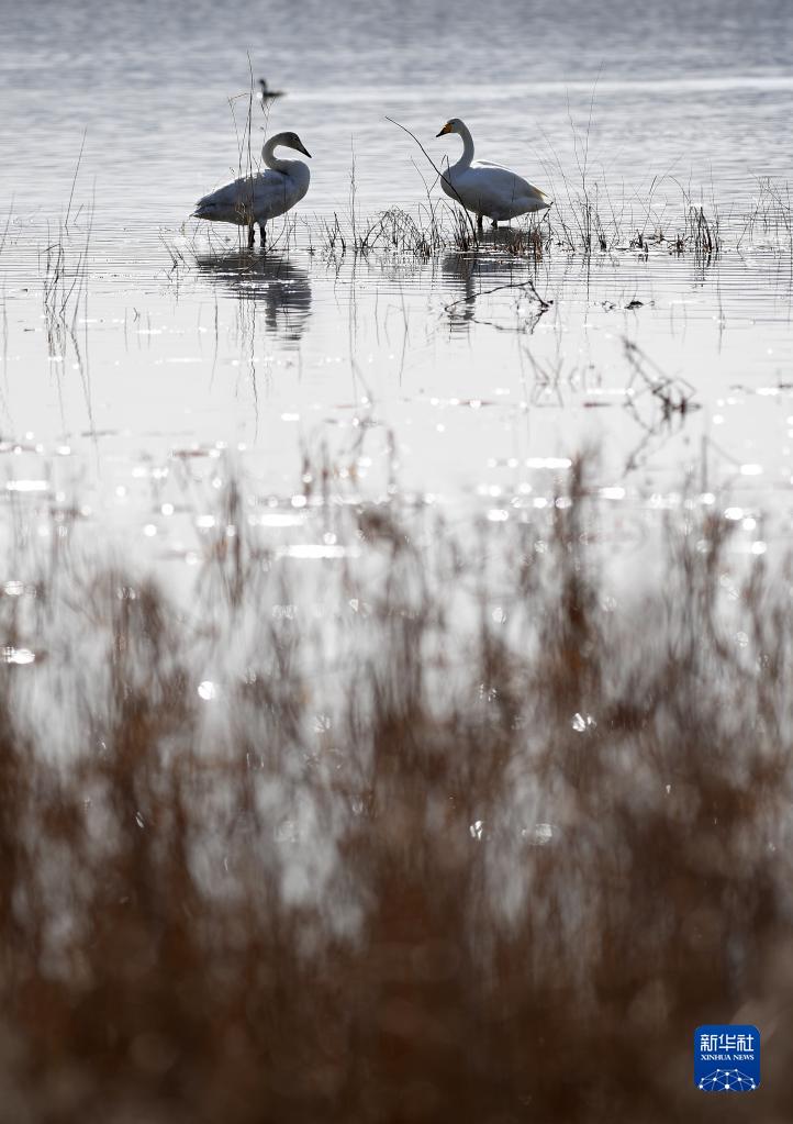 栖息在中卫市香山湖国家湿地公园的大天鹅(3月2日摄)。随着气温逐步回升,宁夏中卫市香山湖国家湿地公园迎来二十多只大天鹅在此栖息、觅食。据了解,中卫市近年来积极实施推进宁夏黄河流域生态保护和高质量发展先行区建设,在黄河生态整治、滩区治理等一系列措施实施下,黄河湿地生态环境明显改善,每年春秋季节都会迎来大批候鸟来此驻足。新华社记者 王鹏 摄