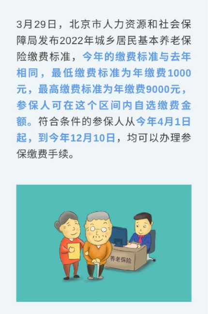 中新网3月29日电据北京市人力资源和社会保障局官方微博29日消息,北京市人力资源和社会保障局发布2022年城乡居民基本养老保险缴费标准,今年的缴费标准与去年相同,最低缴费标准为年缴费1000元,最高缴费标准为年缴费9000元,参保人可在这个区间内自选缴费金额。符合条件的参保人从今年4月1日起,到今年12月10日,均可以办理参保缴费手续。
