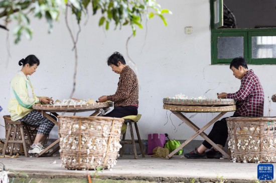 6月13日,在浙江省湖州市德清县洛舍镇东衡村的蚕种基地,蚕农削茧验蛹。