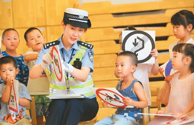 近日,辽宁省东港市公安局交警大队在辖区幼儿园开展“交通安全伴我行”教育活动,让孩子们提高交通安全意识。图为8月15日,民警在东港市恩舟幼儿园教孩子们识别交通标志。 |