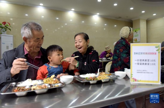 10月8日,安徽省合肥市蜀山区石油宾馆助老餐厅内,蒋明珠(左一)和朱文秀(左三)两位老人带着自己的孙子就餐。