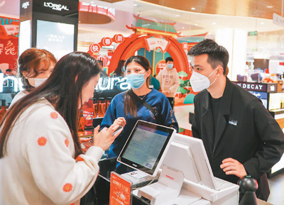 今年春节假期,海南离岛免税消费持续火爆。据海口海关统计,1月21日至1月27日,海口海关共监管离岛免税购物金额15.6亿元,比2022年春节假期增长5.88%;免税购物人数15.7万人次,比2022年春节假期增长9.51%;人均消费9959元。图为1月27日,在海南海口日月广场的海控全球精品免税城内,工作人员为游客结算免税商品。