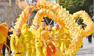 正月里,各地群众载歌载舞,通过锣鼓、秧歌、彩船等丰富多彩的形式喜迎新春。图为1月28日,湖北省十堰市郧阳区教育局代表队在表演秧歌。 |