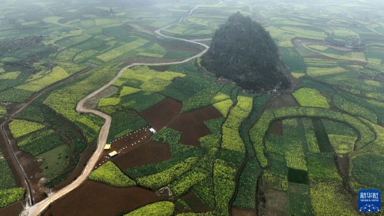2月17日拍摄的贵州省六盘水市六枝特区木岗镇万亩油菜基地(无人机照片)。