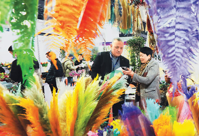 2月21日,第十七届全国仿真花、婚庆道具及喜庆用品交易会在浙江义乌国际博览中心开幕,这也是2023年义乌首展。本届展会展览面积约5万平方米,汇集了全国500余家仿真植物花卉、婚庆道具等领域的知名品牌和源头厂商。图为外商在采购仿真植物花卉。