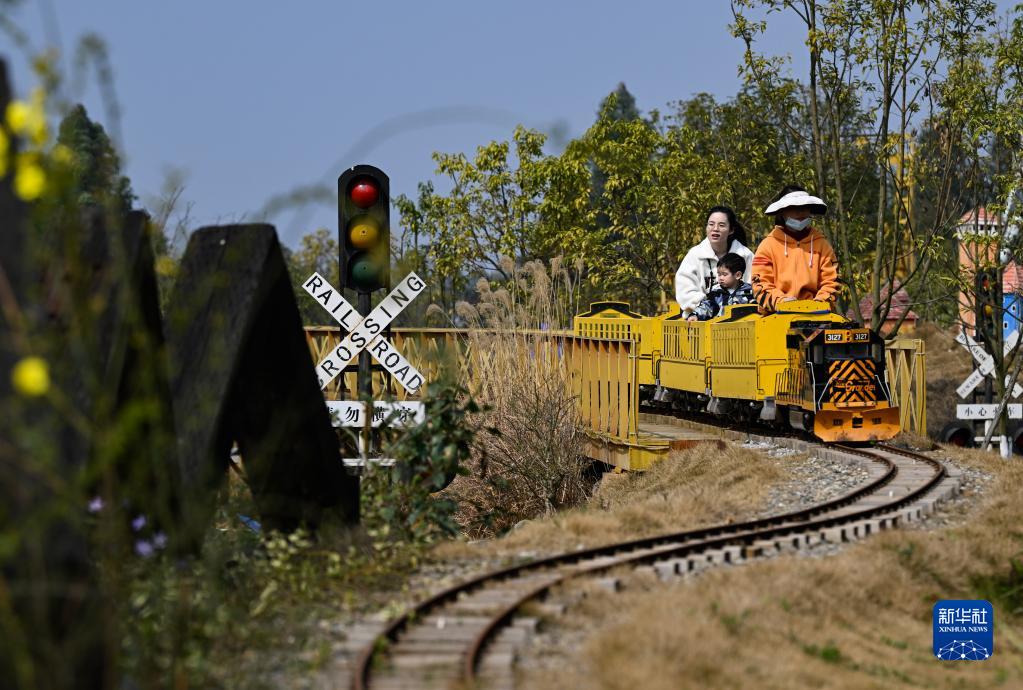 2月25日,游客在四川眉山市仁寿县中铁火车来斯休闲体验园乘坐小火车游玩。