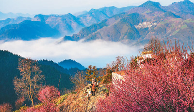 春暖花开,万物复苏,人们纷纷外出踏青赏花,享受春光。图为2月26日,游人在安徽省歙县霞坑镇石潭村观赏梅花、云海美景。