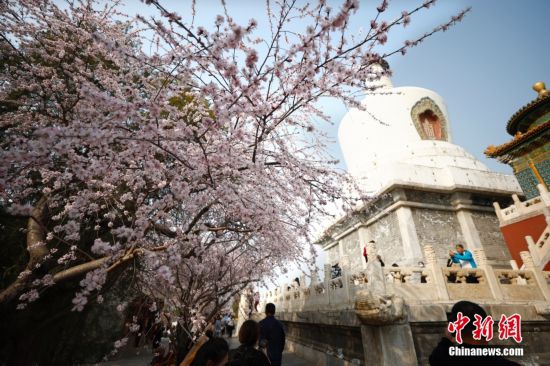 3月8日,北京,游客在北海公园欣赏山桃花。中新社记者 富田 摄