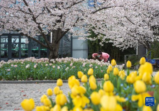 近日,浙江省宁波市植物园内的樱花、海棠、郁金香等竞相绽放,与垂柳、古建筑等相互映衬,构成一幅幅和美的春景。