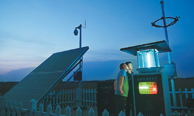 日前,在山东省聊城市东昌府区广平镇四韩村高标准农田物联网监测站,技术人员对智能虫情测报灯进行调试。 |