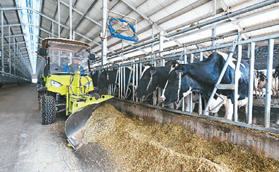 位于天津市宝坻区国家现代农业产业园的天津天食智慧牧场里,80多名管理人员借助智能精料配比饲喂、牛舍温湿度联网监测、感应式降温系统等智能科技,饲养着牧场里的2300多头奶牛,实时掌握着牛舍内奶牛的健康情况及产奶记录,提升产奶效率和饲喂精细度。图为5月15日,工作人员在牛舍内工作。 |