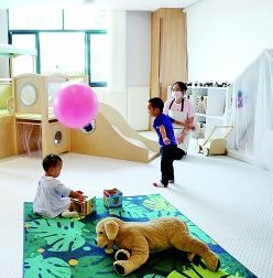 “宝宝屋”挨着长者食堂,有100多平方米的室内空间,两间半开放教室,还有露台的室外活动空间,可同时容纳45位1至3岁年龄段幼儿。整个三楼大厅,则是“宝宝屋”的综合服务区域,承担着接待、服务咨询、晨检、母婴照护等功能。