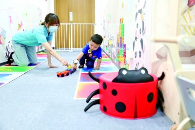 孩子在上海市静安区江宁路街道的社区“宝宝屋”与照护者做游戏。资料图片