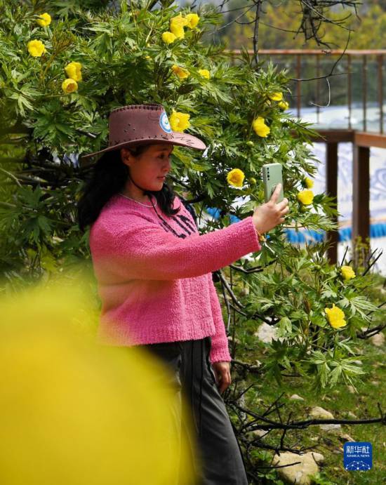 5月28日,一名游客在米林市南伊珞巴民族乡扎贡沟野生大花黄牡丹前自拍。