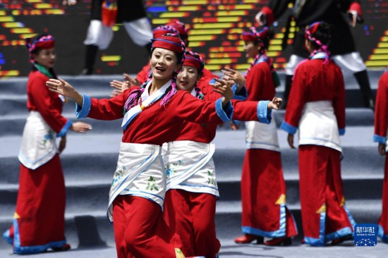 5月28日,演员在米林市第十五届黄牡丹藏医药文化旅游节开幕式上表演节目。