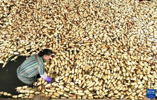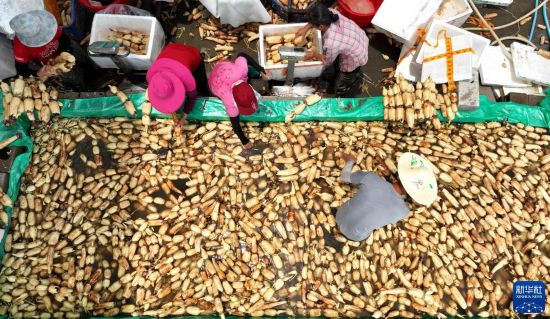 5月29日,在广西柳州市柳江区百朋镇,农民在藕田边的收购点清洗莲藕(无人机照片)。