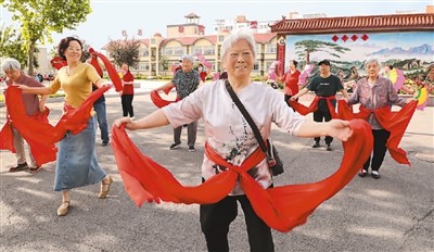 5月23日,山东省东营市东营区辛店街道和堂集·辛店老年公寓,老人们在扭秧歌。该机构是集五保供养、社会托养、社区居家养老功能为一体的养老服务中心,配套建设了棋牌室、娱乐室、医务室、心理咨询室、康复训练厅等功能室,满足老年人的健康生活及精神需求。