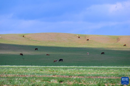 5月30日,牛群在内蒙古锡林郭勒盟苏尼特右旗境内的草原上悠闲觅食。