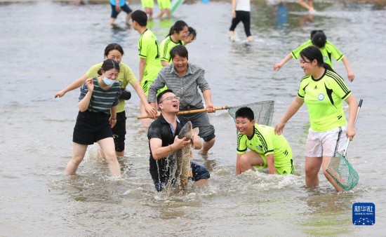 5月30日,在淮安市洪泽区岔河镇,人们在捉鱼比赛活动现场。