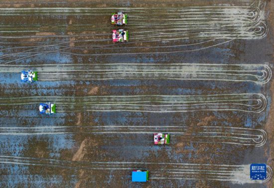 5月30日在淮安市洪泽区岔河镇拍摄的机械插秧比赛(无人机照片)。