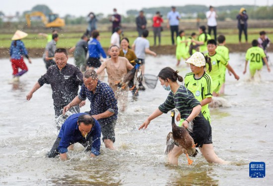 5月30日,在淮安市洪泽区岔河镇,人们在插秧节上参加抓鸭比赛。
