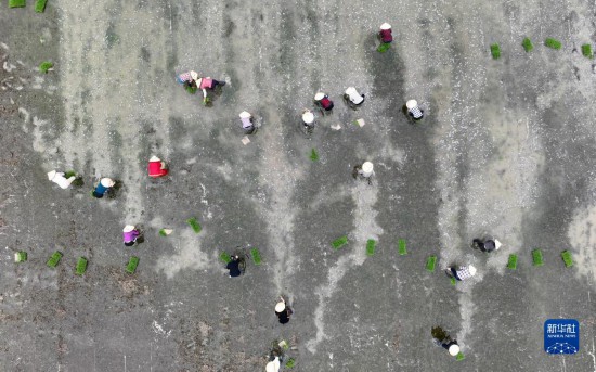 5月30日,在淮安市洪泽区岔河镇,人们在插秧节上比赛插秧(无人机照片)。