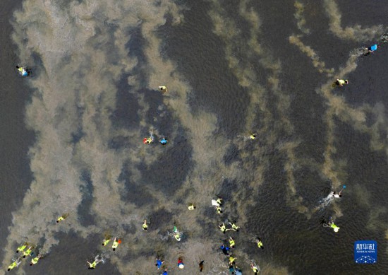 5月30日,在淮安市洪泽区岔河镇,人们在插秧节上参加摸鱼比赛(无人机照片)。