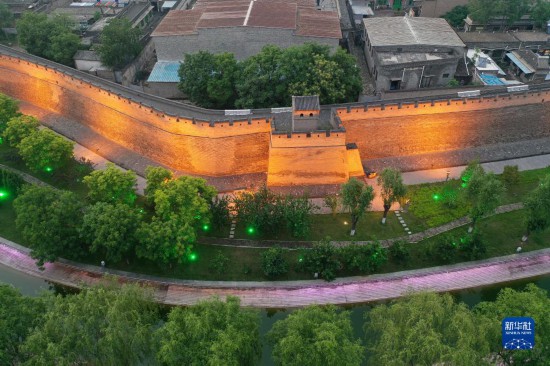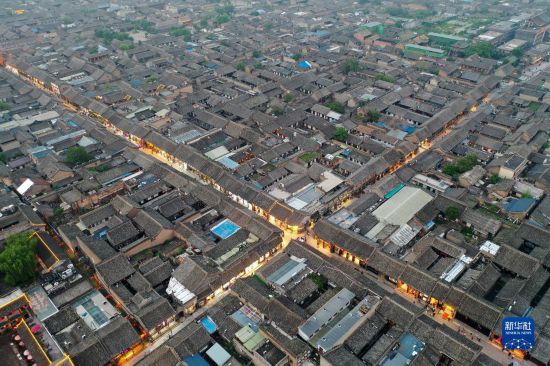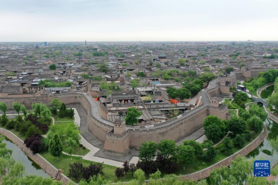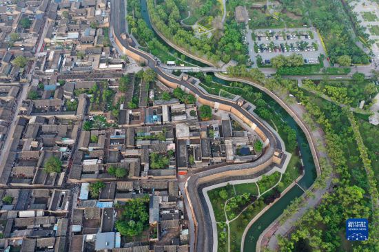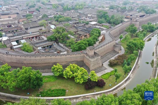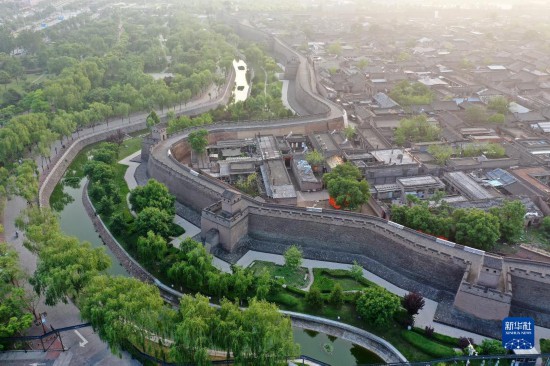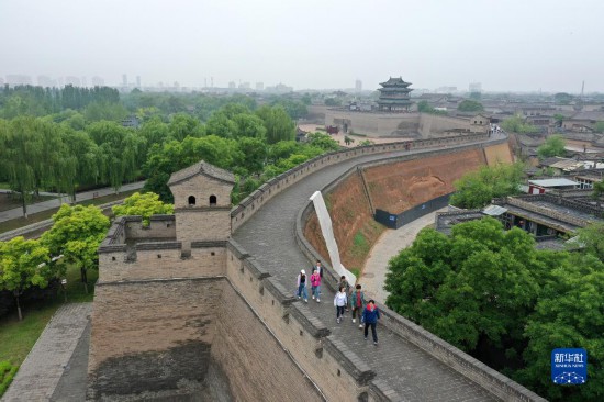 游客在平遥古城城墙上游览(5月30日摄,无人机照片)。