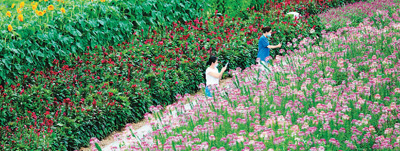 游客在河北省滦平县热河中药花海小镇展示园休闲游玩。 |