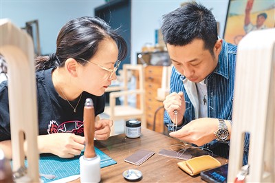 作为今年上海市为民办实事项目“社会大美育课堂”的重要组成部分,今年上海市民艺术夜校春季班共开设教学点位123个、课程278门、招收学员6507人。夜校学习内容包括传统文化、时尚文化、非遗技艺、江南文化以及区域文化等。图为5月8日,上海市宝山区淞南镇社区文化活动中心,老师(右)正在指导学生皮具制作技巧。 |