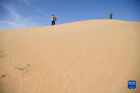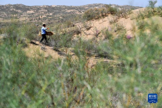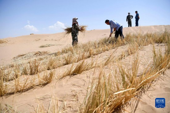 工作人员在白芨滩国家级自然保护区补扎草方格(6月7日摄)。
