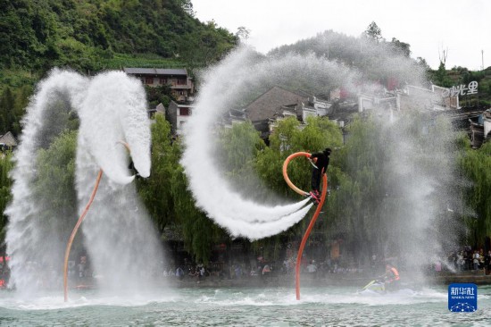 6月17日,工作人员在镇远古城 阳河畔进行水上飞人表演。
