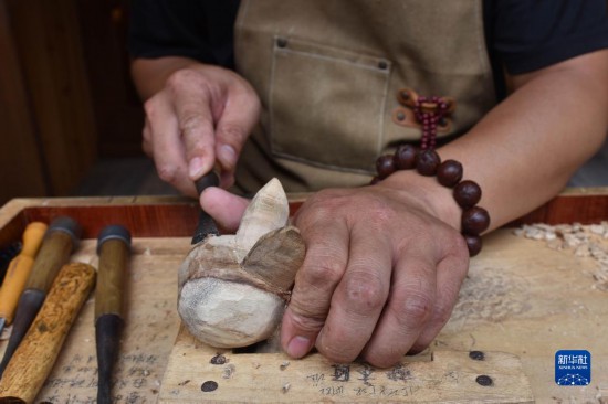6月17日,一名手工艺人在贵州省镇远古城一家木雕店雕刻工艺品。