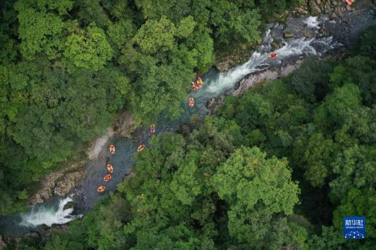 6月17日,游客在镇远县高过河景区漂流(无人机照片)。