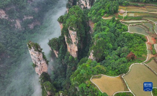 近日,湖南张家界迎来连续降雨。雨后,云雾在连绵耸立的峰林间飘荡,悬崖峭壁之上的农田在云雾中若隐若现,构成一幅幅独特的生态画卷。