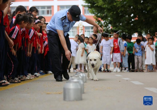 6月25日,山东省沂南县公安局在辛集镇中心小学开展禁毒主题宣传活动,给小朋友演示缉毒犬嗅毒。