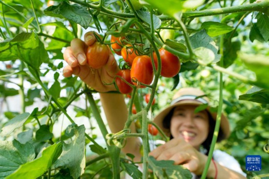 7月3日,市民在河北省唐山市路北区一处家庭农场内采摘樱桃西红柿。