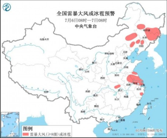 全国雷暴大风或冰雹预警图(7月6日08时-7日08时)。图片来源:中央气象台网站