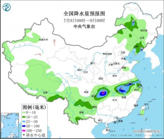 全国降水量预报图(7月6日08时-7日08时)。图片来源:中央气象台网站