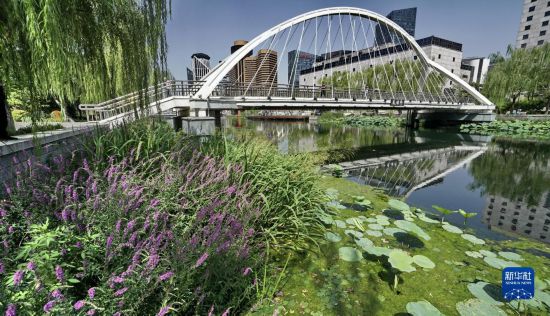 新建成的展示城市文化历史的亮马河燕莎桥滨水通道(7月5日摄)。