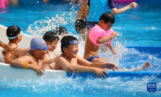 7月9日,孩子们在山东省滕州市一处水上公园戏水消暑。