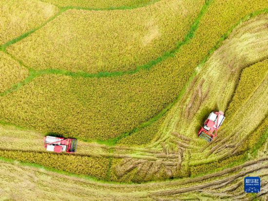 7月10日,在湖南省永州市道县四马桥镇金狮庵村,农民驾驶农机在田间收割早稻(无人机照片)。