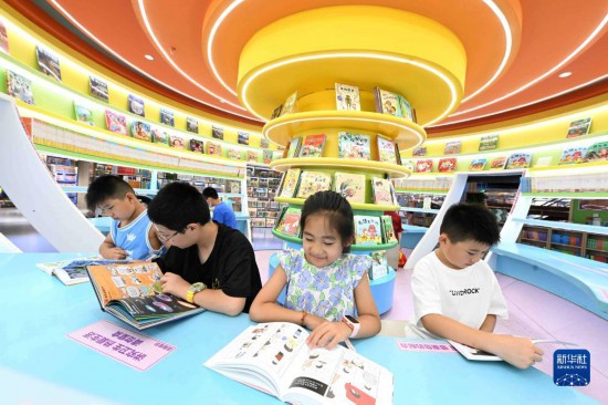 7月12日,小朋友在河北省石家庄市一家书城阅读。