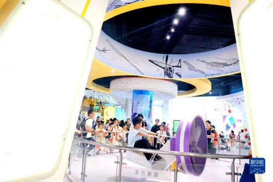 7月12日,小朋友在浙江省科技馆里参观体验。