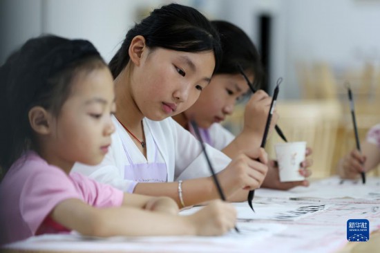 7月12日,在山东省临沂市郯城县郯城街道龙泉社区,孩子们在上书法课。