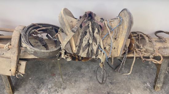 图为五里村村史馆展览的过去运输货物和生活必需品上山的马驼用具。新华网 陈颖 摄