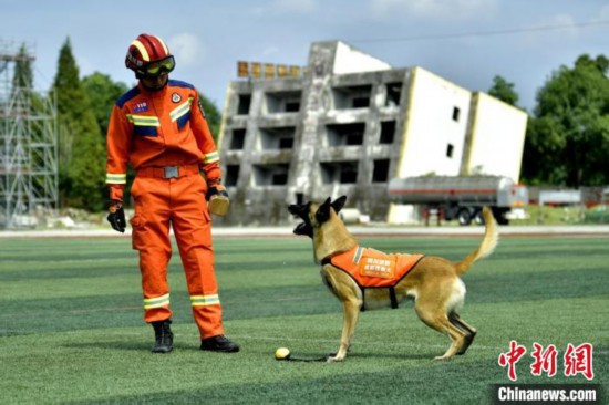 退役消防搜救犬“犀莉”和训导员。中新网记者 刘忠俊 摄